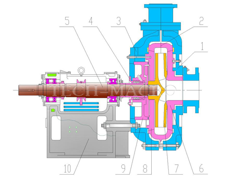 1 Cover Plate 2 Volute Liner 3 Frame Plate 4 Expeller Ring 5 Shaft 6 Throat Bush 7 Impeller 8 Back Liner 9 Seal Box 10 Frame